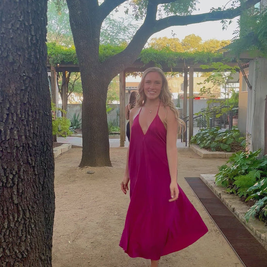 This dress is made from 100% silk and hand dyed with Brazillian Sappanwood to achieve a rich magenta color, alive with dimension. Natural variation in the dyeing process creates slight variations in shade throughout the dress, making each piece one of a kind.
